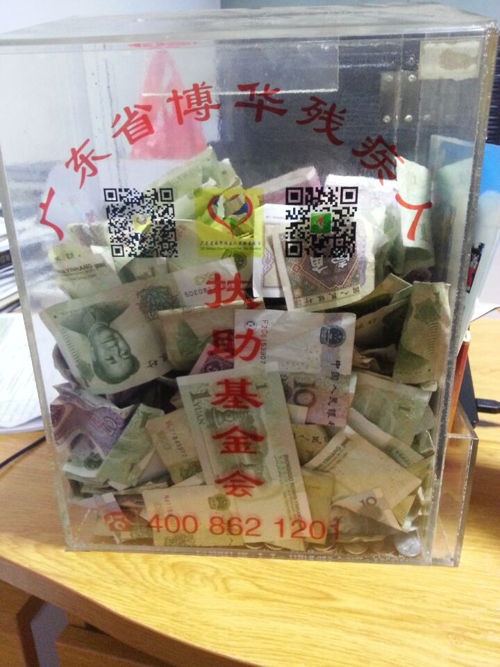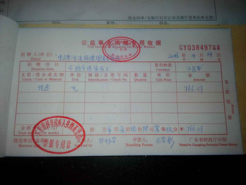 2016 年4月14日,中山市沙溪荷塘月色素食馆0038号零钱随手捐爱心箱第三次开箱共筹得善款766.09元,捐给本基金会用于资助贫困残疾人。感谢爱心人士马先生!