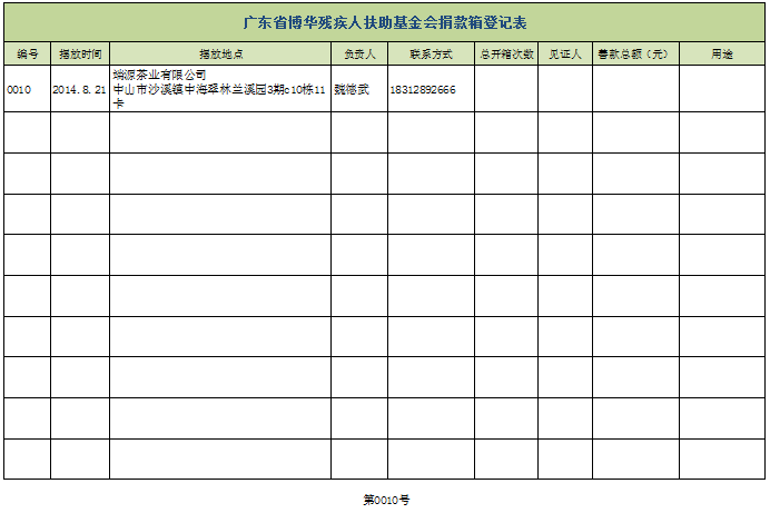 2014年8月21日下午,端源茶业有限公司(第0010号爱心箱)也伸出援手,加入了基金会“零钱随手捐”献爱心活动。该活动所筹集之善款用于资助贫困残疾人进行康复教育,详情请登录基金会网站。扶残助残,功德无量!感谢魏老板!
