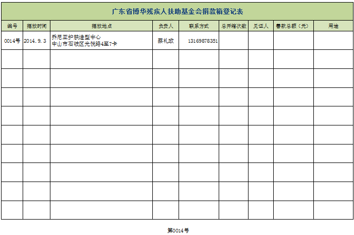 2014年9月3日上午,中山市乔尼亚护肤造型中心(第0014号爱心箱)也伸出援手,加入了基金会“零钱随手捐”献爱心活动。该活动所筹集之善款用于资助贫困残疾人进行康复教育,扶残助残,功德无量!感谢蔡总!