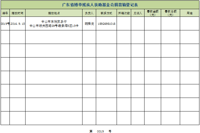 2014年9月15日下午,中国梦·梦之蓝中山市东区东悦贸易行(0019号爱心箱)也伸出援手,加入了基金会“零钱随手捐”献爱心活动。该活动所筹集之善款用于资助贫困残疾人进行康复教育,扶残助残,功德无量!感谢胡总!