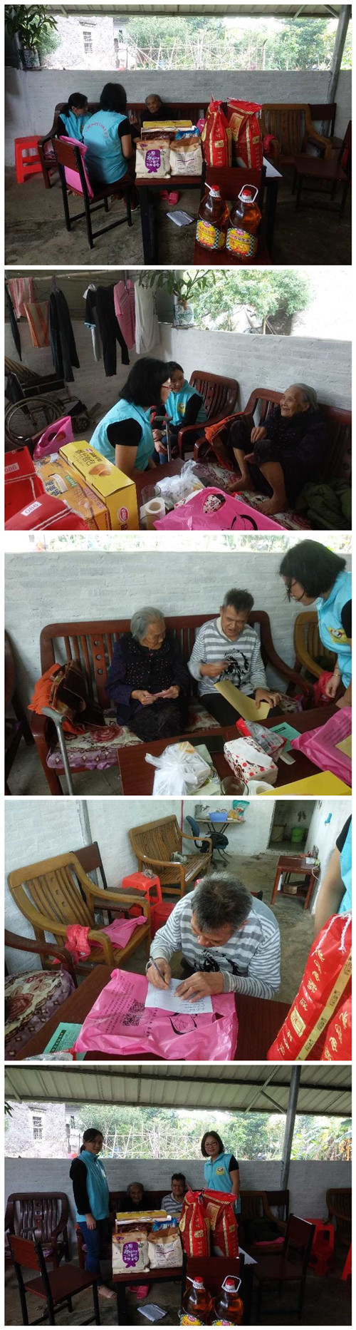 2018年4月26日上午,本基金会工作人员和志愿者来到了中山市东凤镇两智障人士母亲麦婆婆家进行探访并慰问。从2014年9月开始,麦婆婆家是我们每月必到的探访户,今天工作人员如常买来了大米和油等物资,给麦婆婆家送上了每月500元的助养费。阿富和麦婆婆看到我们都很开心,热情的招呼我们坐下来。这次看到麦婆婆明显感觉到她瘦了不少,麦婆婆告诉我们前几天她生病住院了,昨天晚上才回家,这几天胃口不是很好,只是吃了一些粥和面。祝愿麦婆婆身体尽快康复!(麦婆婆:生于1918年,今年已经99岁高龄,这位伟大的母亲对两个天生智障的儿子陈富和和陈满和不离不弃的事迹感动着身边的所有人;大儿子陈满和,生于1940年,智障人士,为本基金会的终身助养对象,2014年9月开始助养至2016年5月生病离世;二儿子陈富和,生于1943年,智障人土,为本基金会的终身助养对象,2014年9月开始助养至今。