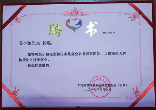 【广东省博华残疾人扶助基金会简讯】2018年8月10日,广东省博华残疾人扶助基金会特聘一直以来支持残疾人事业的揭阳吴小驰先生为本基金会名誉理事,共谋残疾人群体援助之神圣事业!扶残助残,感恩有您!