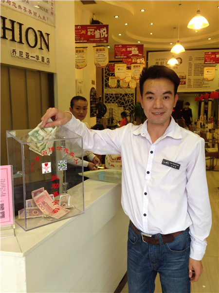 2014年10月24日下午,乔尼亚护肤造型中心-华夏店(0030号爱心箱)也伸出援手,加入了基金会“零钱随手捐”献爱心活动。该活动所筹集之善款用于资助贫困残疾人进行助学、助养。扶残助残,功德无量!感谢吴总!