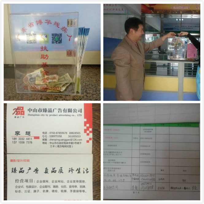 【省博华残疾人扶助基金会“0056号零钱随手捐爱心箱”简讯】2016年1月8日,中山市臻品广告有限公司(第0056号爱心箱)也伸出了援手,加入了基金会“零钱随手捐”献爱心活动,该活动所筹集之善款用于资助贫困残疾人。扶残助残,功德无量!感谢李总!