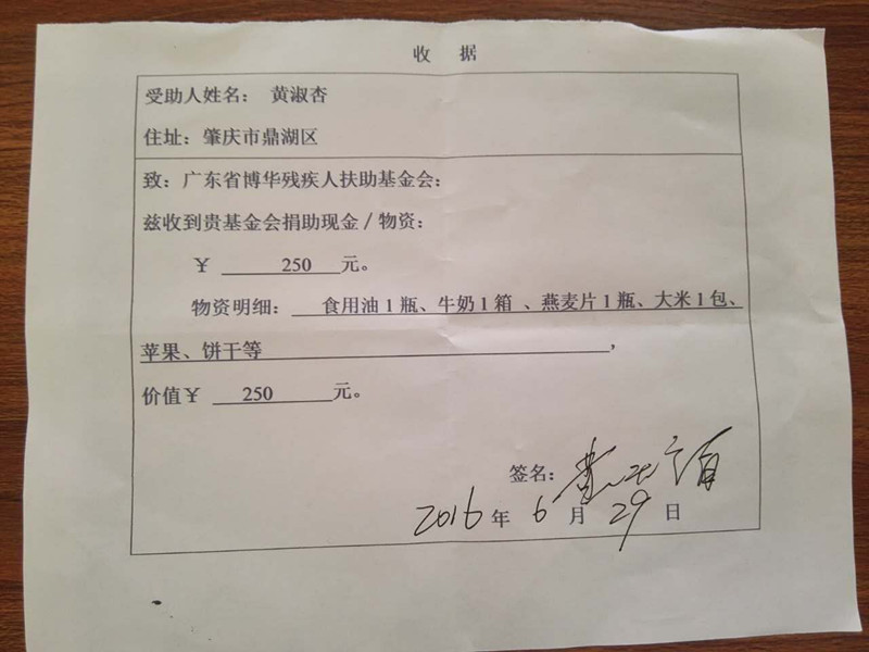 【省博华残疾人扶助基金会简讯】2016年6月29日,本基金会工作人员和义工分别前往中山市东凤镇和肇庆市鼎湖区探访贫困残疾人,并如常送上助养物资和现金。