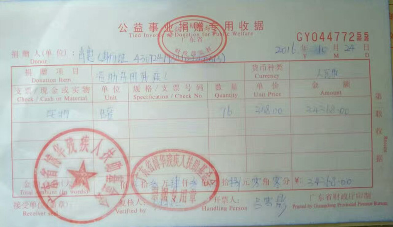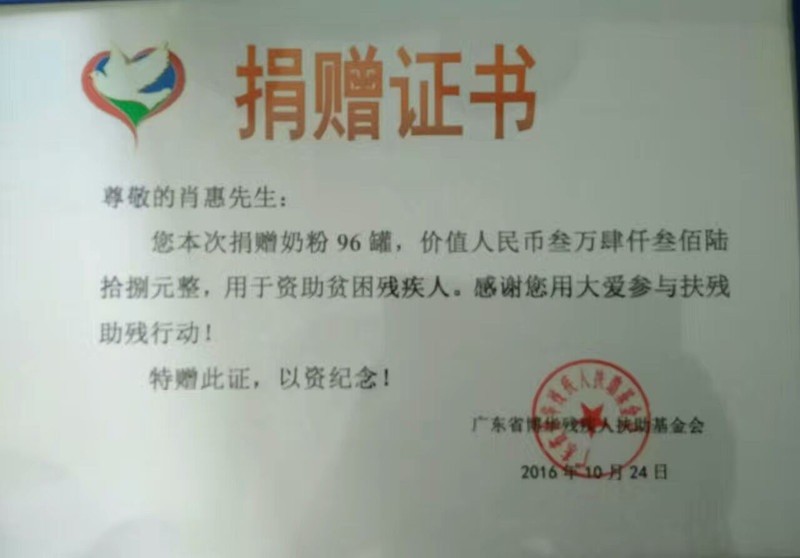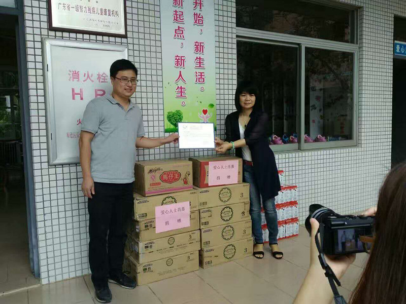 2016年10月25日上午,中山市东升镇爱心人士肖惠先生来到小榄博华特殊教育学校看望特殊学生,并通过本基金会为该校特殊孩子们捐赠了价值人民币34368元的奶粉;与肖先生同来看望特殊学生的陈小姐与许小姐也给孩子们带来了爱心礼物,问寒问暖,详细了解贫困特殊学生情况,并表示今后定会将爱心延续下去,温暖更多的特殊孩子。感谢小榄公益中心黄主任引荐!扶残助残,有你有我。感恩!