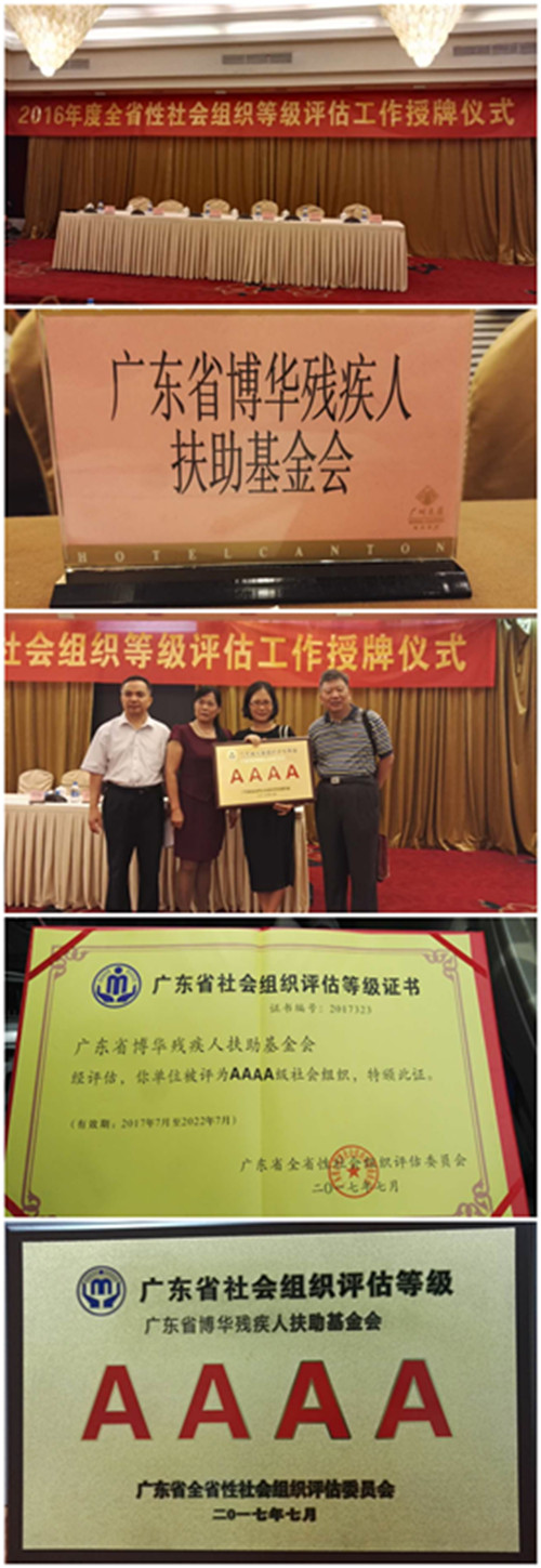 2016年7月20日广东省博华残疾人扶助基金会应邀参加2016年度全省性社会组织等级评估工作授牌仪式,本基金会在此次评估中获得4A等级资格。值得一提的是:获得3A以上评估等级的社会组织,可以优先接受政府职能转移,可以优先获得政府购买服务,可以优先获得政府奖励。