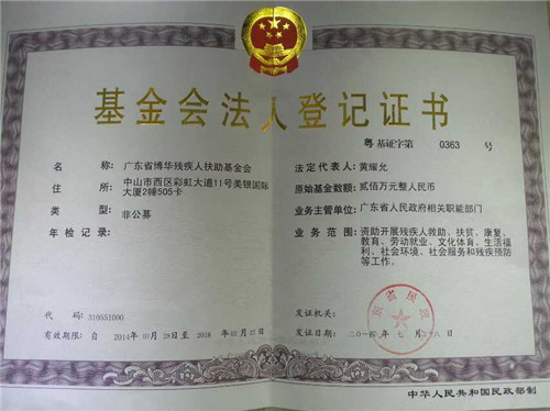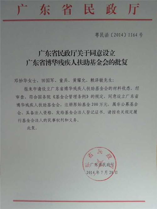 2014年7月28日,广东省博华残疾人扶助基金会获广东省民政厅正式批复及发证,原始基金为200万元人民币,分别由基金会的发起人田国军先生(图一左一)捐赠60万元、、邓妙华女士(图一左三)捐赠50万元、童兵先生(图一左四)捐赠40万元、黄耀允先生(图一左二)捐赠30万元和赖泽敏先生(图一左五)捐赠20万元。本基金会为非公募基金会,主要是资助开展残疾人救助、扶贫、康复、教育、劳动就业、文化体育、生活福利、社会环境、社会服务和残疾预防等工作。