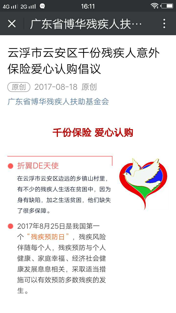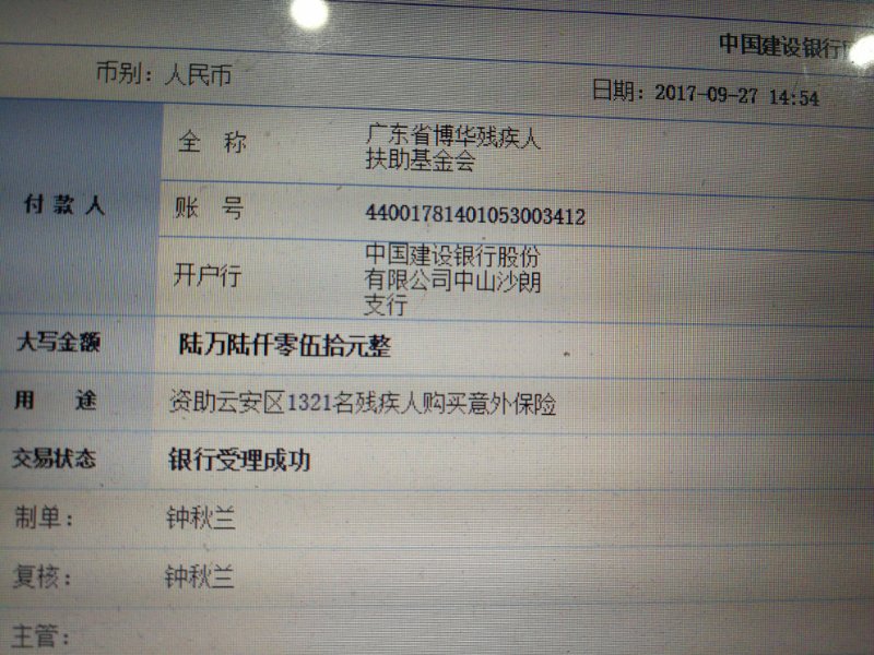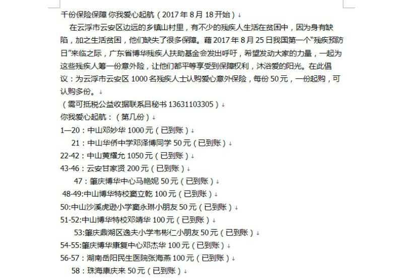 2017年9月27日,广东省博华残疾人扶助基金会资助云浮市云安区1321名残疾人士购买意外保险,成功办理,众爱心人士捐赠的善款合计66050元通过基金会帐号转入中国人寿保险股份有限公司云浮分公司。“千份爱心 保障起航”捐赠于2017年8月18日发起认捐,9月8日停止接受捐赠,历时20天,感恩众爱心人士的无私馈赠!本次活动的捐赠仪式将于2017年10月份举行(具体时间另行公告),届时诚邀各位爱心人士现场见证。
