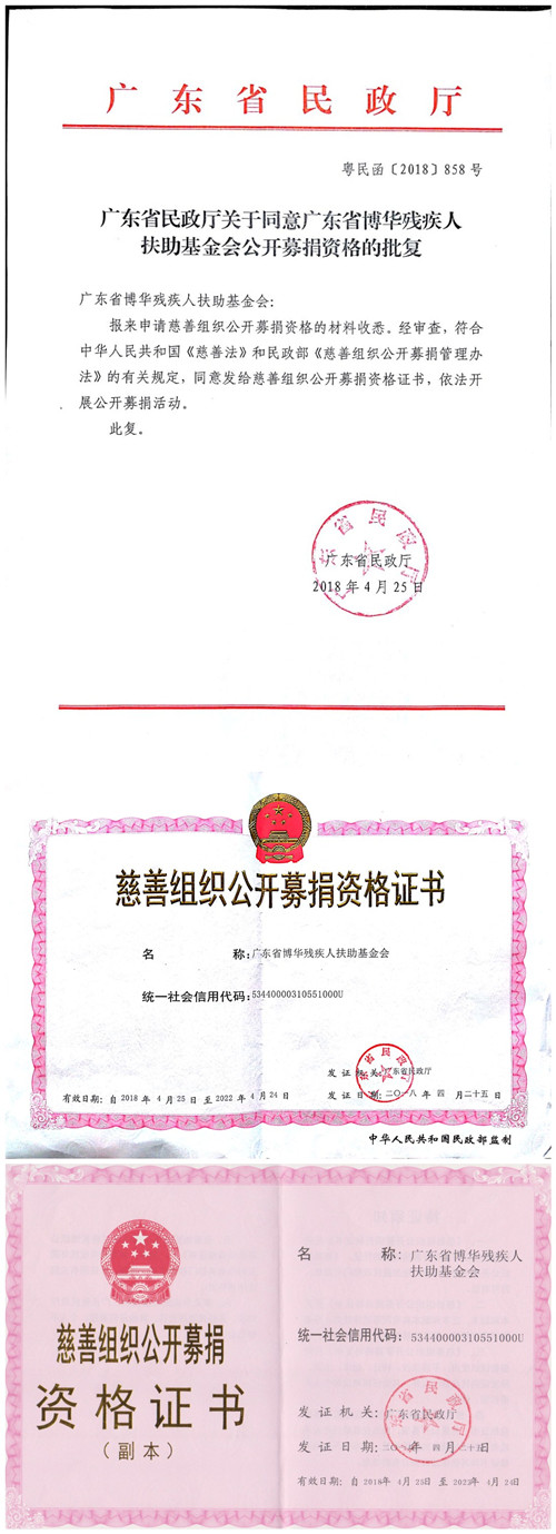 广东省民政厅于2018年4月25日同意并发给广东省博华残疾人扶助基金会公开募捐资格证书,这表明广东省博华残疾人扶助基金会可以依法开展公开募捐活动!《中华人民共和国慈善法》第三章第二十六条规定:不具有公开募捐资格的组织或者个人基于慈善目的,可以与具有公开募捐资格的慈善组织合作,由该慈善组织开展公开募捐并管理募得款物。公开募捐是慈善组织取得慈善财产的重要方式,其可以采取的具体方式多种多样。在立法中明确慈善组织开展公开募捐和定向募捐的方式,有利于给慈善组织提供明确的指引,有利于进一步明确划分公开募捐和定向募捐的界限,有利于慈善组织依法开展慈善募捐活动。开展公开募捐,可以采取下列方式(一)在公共场所设置募捐箱;(二)举办面向社会公众的义演、义赛、义卖、义展、义拍、慈善晚会等;(三)通过广播、电视、报刊、互联网等媒体发布募捐信息;(四)其他募捐方式。