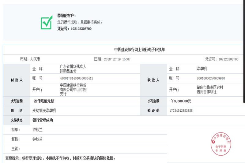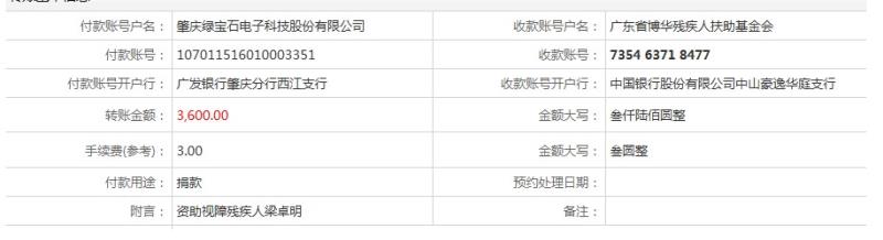 【广东省博华残疾人扶助基金会简讯】2018年12月18日,本基金会收到来自肇庆绿宝石电子科技股份有限公司捐赠人民币3600元,此善款将用于定向助养肇庆市困难视障残疾人梁卓明2019年的生活费(每月助养300元),2018年12月19日,基金会已将该善款转账至受助人。感谢肇庆绿宝石电子科技股份有限公司的爱心奉献!