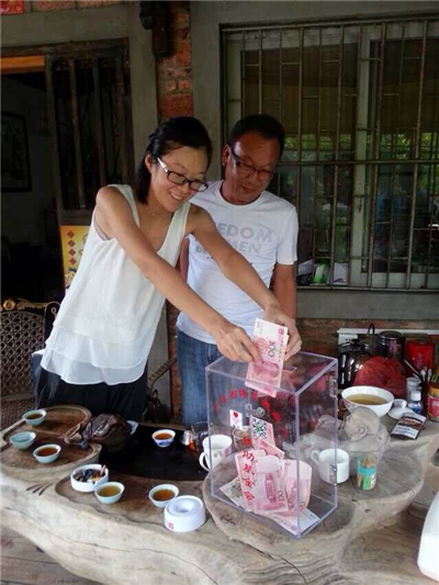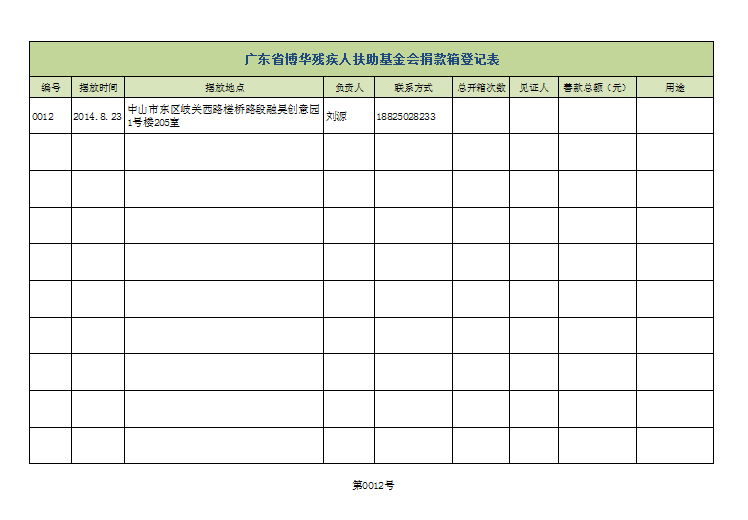 2014年8月23日,刘总在中山市五桂山的名树场(第0012号爱心箱)也伸出援手,加入了基金会“零钱随手捐”献爱心活动。该活动所筹集之善款用于资助贫困残疾人进行康复教育。扶残助残,功德无量!感谢刘总!