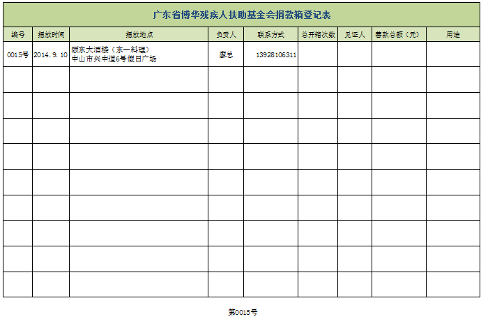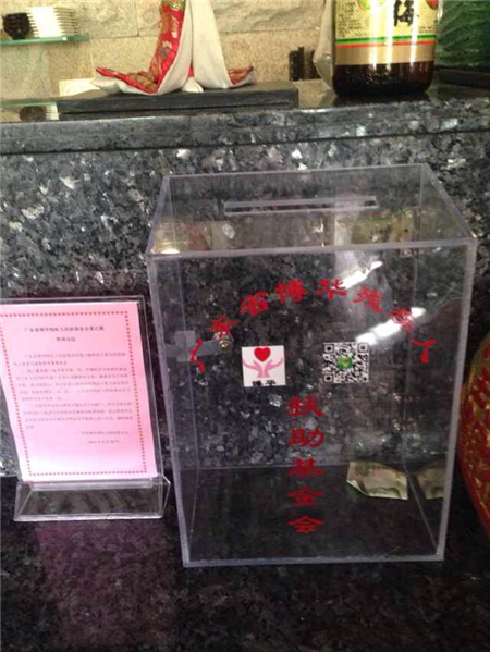 2014年9月10日上午,颐东大酒楼东一料理(第0015号爱心箱)也伸出援手,加入了基金会“零钱随手捐”献爱心活动。该活动所筹集之善款用于资助贫困残疾人进行康复教育。扶残助残,功德无量!感谢廖总!