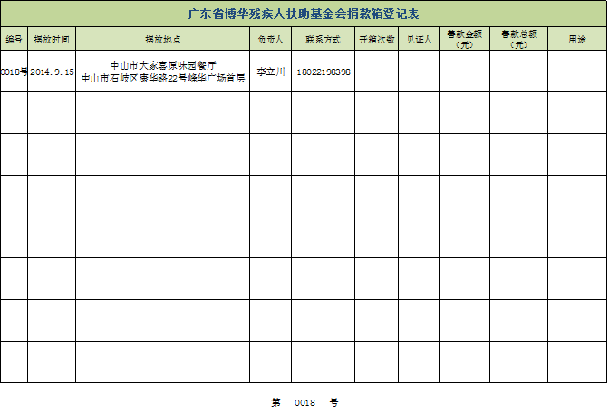 2014年9月15日上午,中山市大家喜原味园餐厅(0018号爱心箱)也伸出援手,加入了基金会“零钱随手捐”献爱心活动。该活动所筹集之善款用于资助贫困残疾人进行康复教育,功德无量!感谢李总!